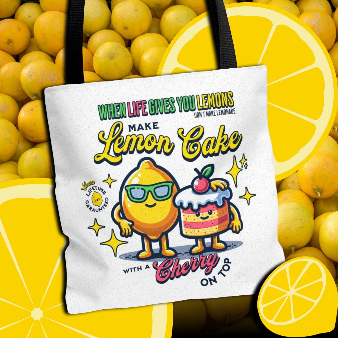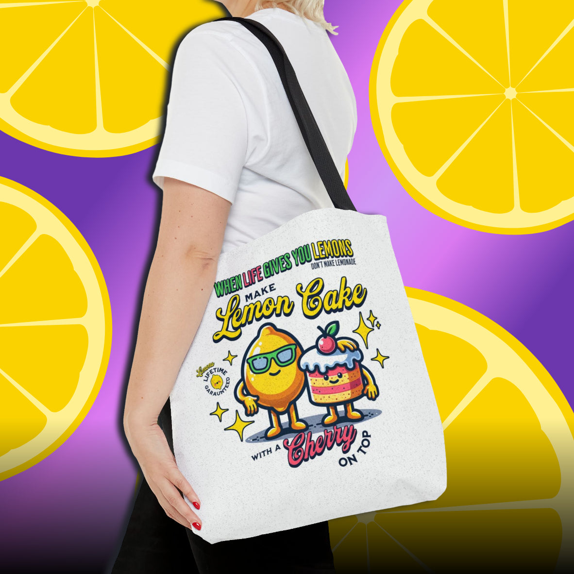 Transform the lemons that life throws your way into something unique and delicious – like a lemon cake with a cherry on top. Don't let any challenges hold you back, embrace an attitude of positive vibes only and carry it with you wherever you go with this stylish and functional tote bag. From running errands to going on adventures, this tote has got you covered.