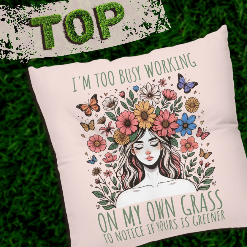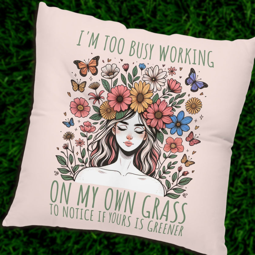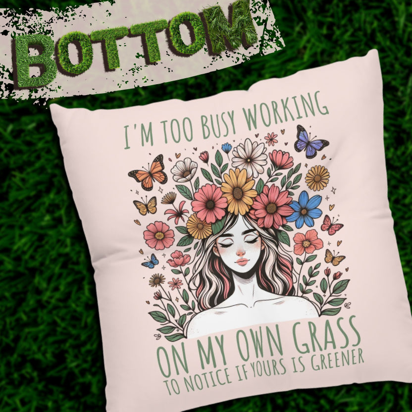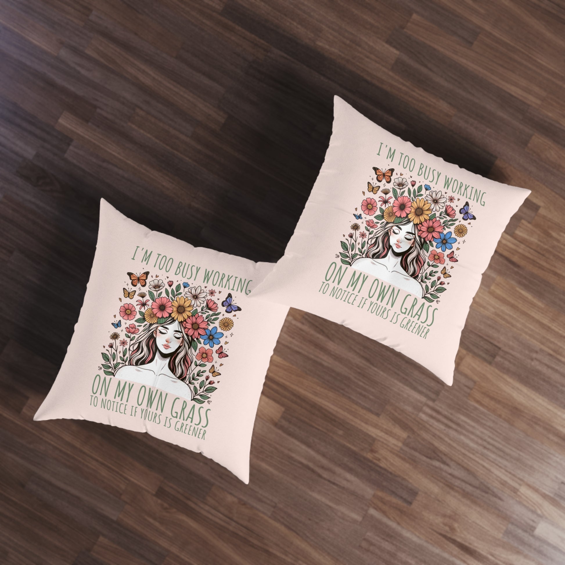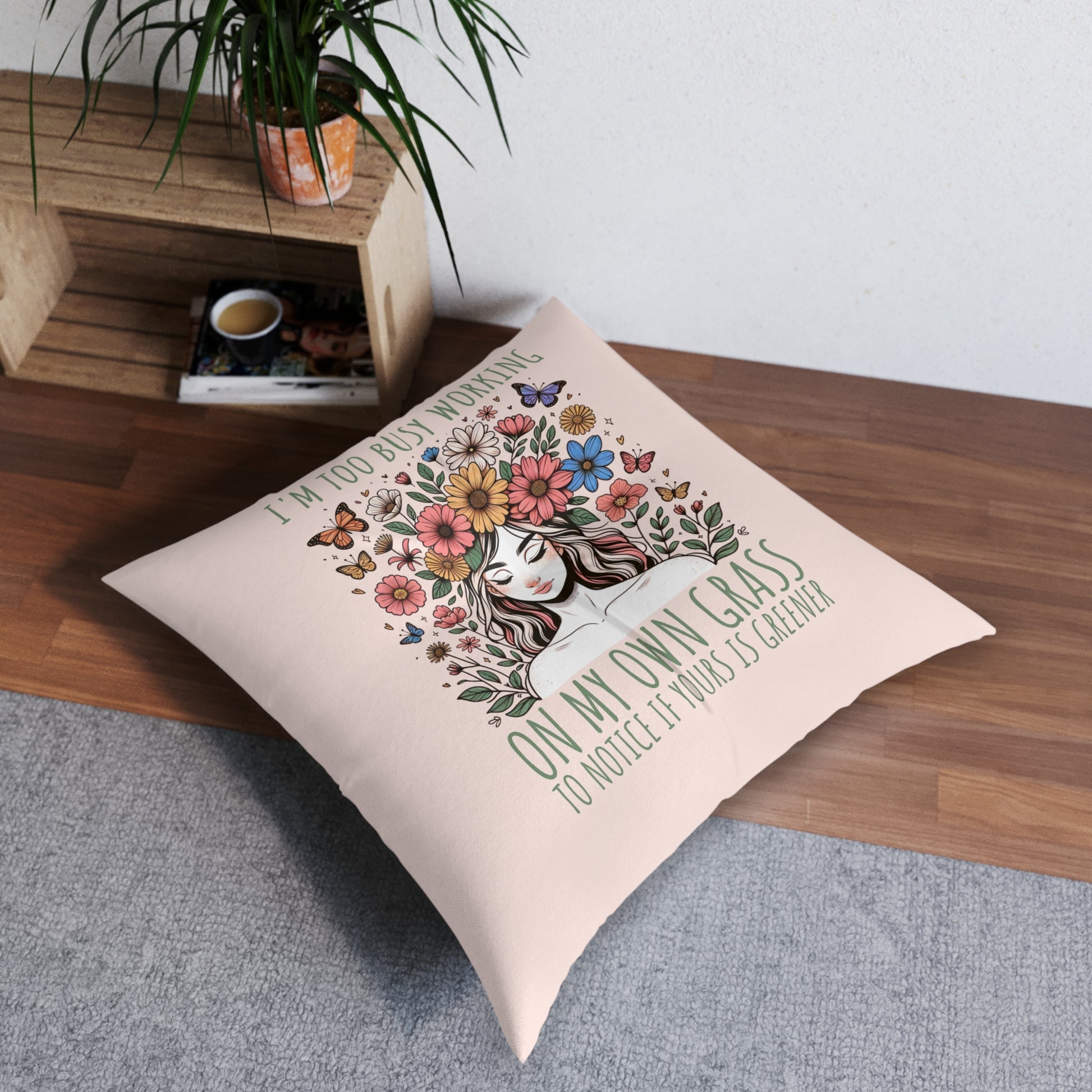 I'm too busy working on my own grass to notice if yours is greener. Comparison is the thief of joy. Stop comparing and start thriving with My Grass Is Greener, Square Tufted Floor Pillow. Our vibrant pillow will give you the energy and focus to keep pushing towards your goals, even when life gets busy.